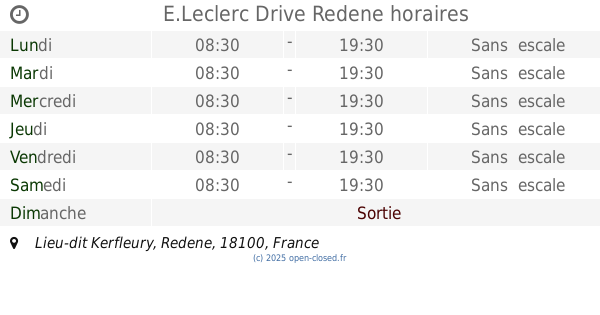 Please note that the information for E.Leclerc Drive Dans Redene, Lieu-dit Kerfleury and all other Stores is for reference only.
